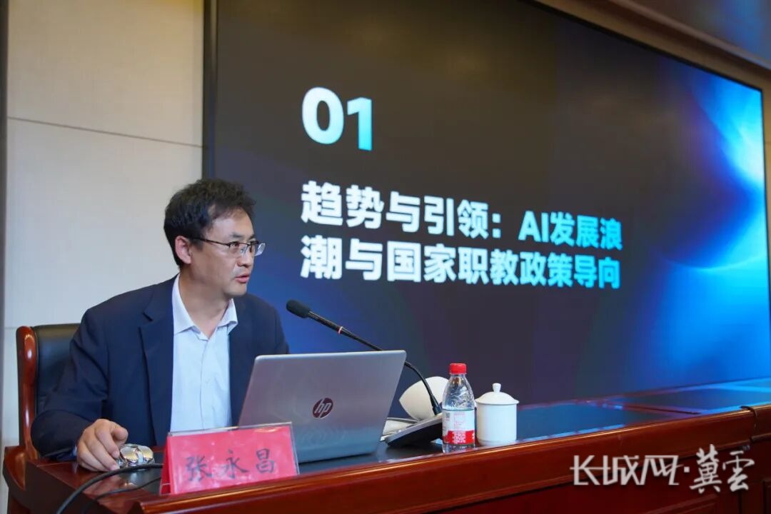 信息工程学院院长张永昌教授围绕《拥抱AI,与时代同行》主题,结合2025年世界人工智能大会最新动态与国家“人工智能+”战略部署,分析了AI对职业教育的变革意义。他提出,AI应深度融入“教、学、评”全流程,呼吁教师强化教学设计、人机协同等核心能力,推动AI技术应用与专业建设深度融合,共创智能教育新生态。