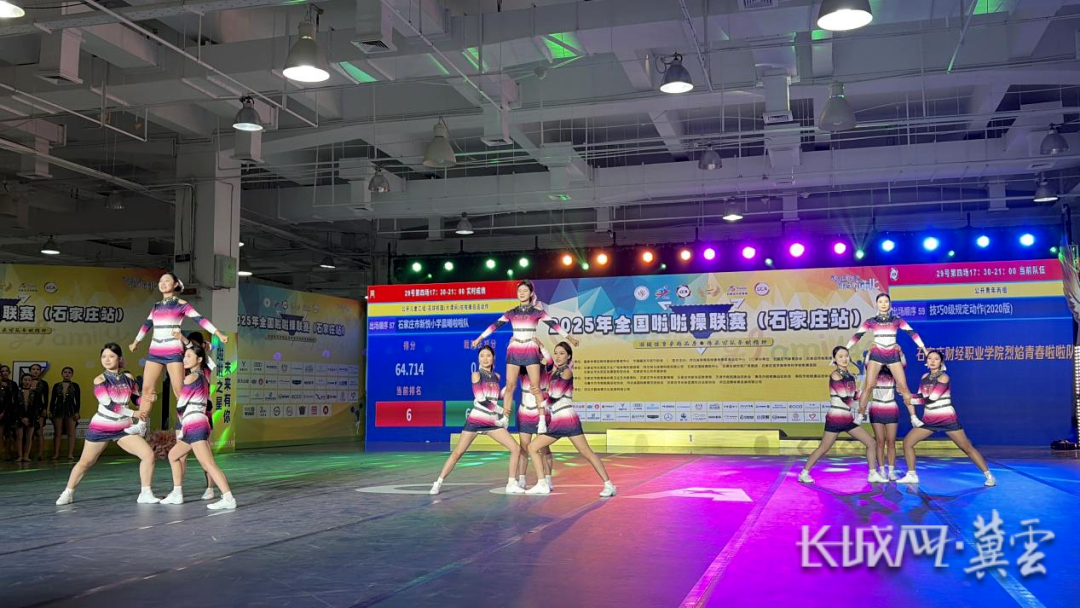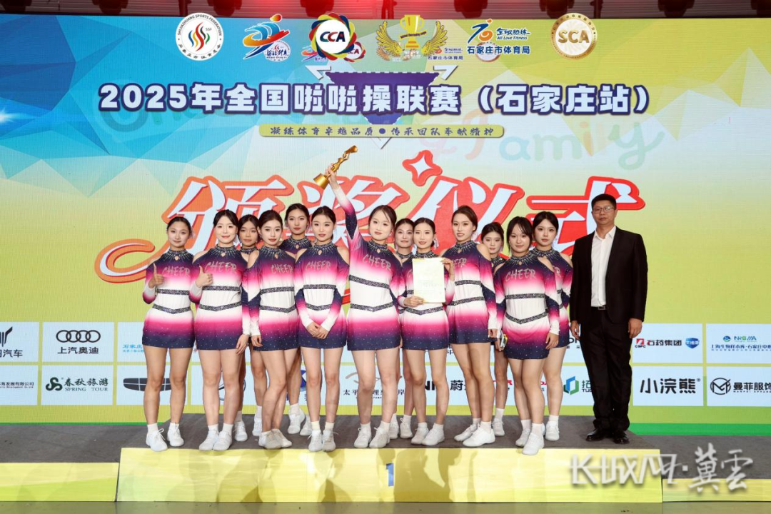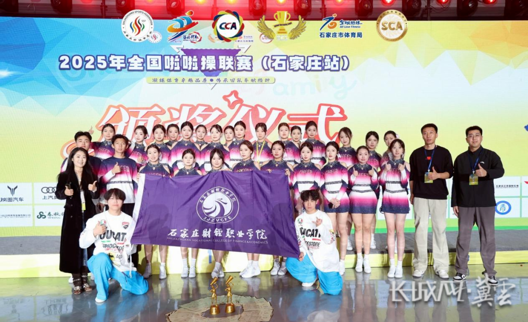 近日,2025年全国啦啦操联赛(石家庄站)在石家庄国际博览中心落幕。本次大赛由国家体育总局体操运动管理中心、中国蹦床与技巧协会主办,石家庄市体育总会、石家庄市啦啦操协会承办,汇聚了全国各地的优秀队伍同台竞技。石家庄财经职业学院“烈焰青春”啦啦队凭借出色的表现,在激烈角逐中脱颖而出,一举斩获花球啦啦操一等奖、技巧啦啦操一等奖以及双人街舞二等奖的优异成绩,充分展现了学子昂扬向上的精神风貌与卓越的团队实力。