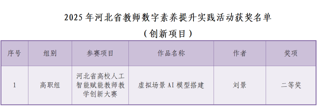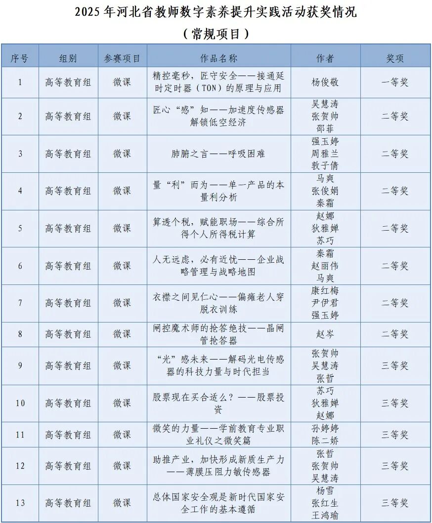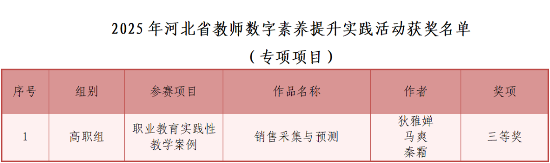 近日,2025年河北省教师数字素养提升实践活动评选结果正式揭晓,石家庄财经职业学院教师凭借扎实的专业能力与创新实践成果再创佳绩。