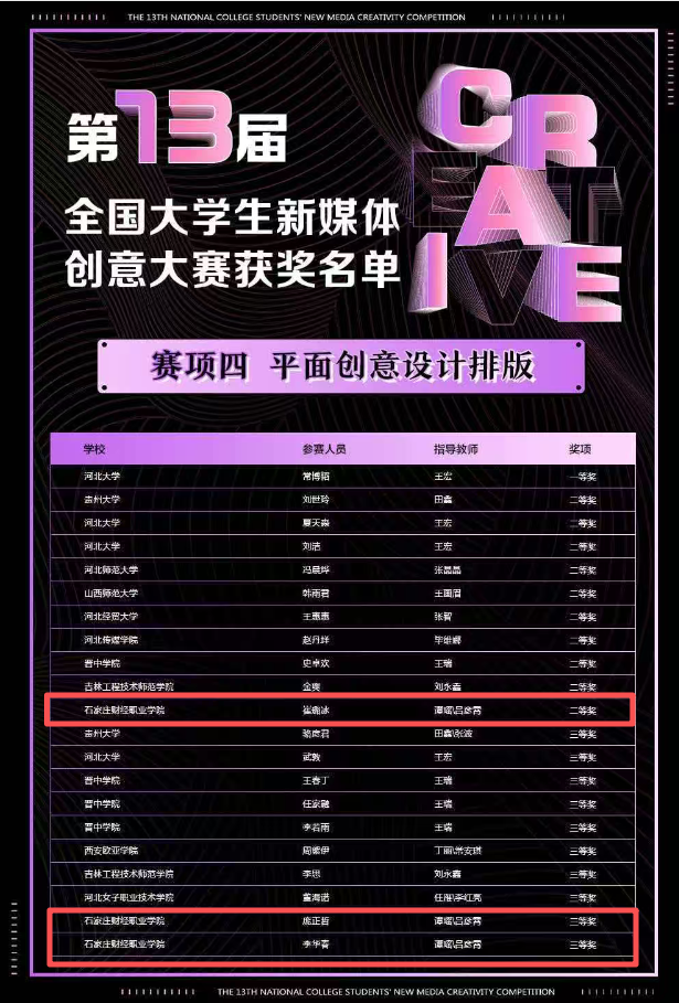 近日,第十三届全国大学生新媒体创意大赛平面创意设计排版赛项全国获奖名单正式揭晓。石家庄财经职业学院传媒学院首次参赛便斩获佳绩,荣获全国二等奖1项、三等奖2项,指导教师谭瑶、吕彦霄获评优秀指导教师。
